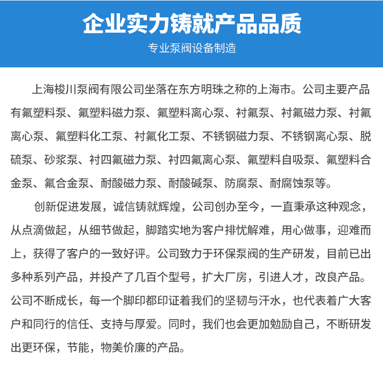 本产品广泛应用于:石油化工、制酸制碱、有色金属冶炼、汽车制造的酸洗工艺、稀土分离、农药、染料、医药、造纸、电镀等行业,适用于输送清液或则含有少量颗粒(固含量≤10%)的腐蚀性介质。